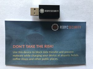 For both shows, we gave away a number trade show swag items including hats, pens, stress balls and notebooks, but by far, our most requested item was the Rebyc Security Data Blocker. We gave away 300 of these combined at the SEC and JAC shows. Not sure what a Data Blocker is? It blocks the data transfer ports when plugging the charging cable for your device into public USB ports, like what you see in a hotel, coffee shop or airport. Essentially, it allows you to charge safely without the risk of malware getting installed on your personal device.